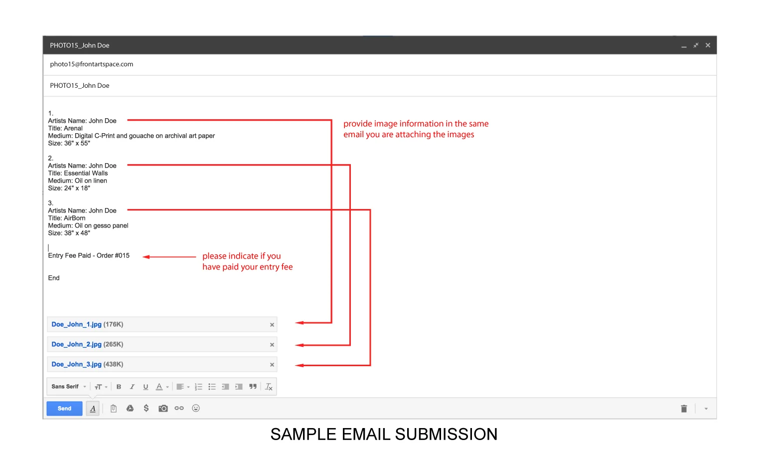 Images must be sent via email to: PHOTO15@frontartspace.com. In the subject line please include: PHOTO15 First Name - Last. See image below: